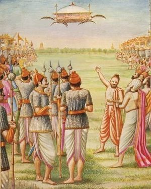 - Es geht um Aussagen im überlieferten epischen Schrifttum Indiens über vernichtende Schlachten zwischen "Göttern" und "Dämonen", unter Verwendung hochtechnologischer Waffen und raumflugtauglicher Flugmaschinen, die - falls historisch verifizierbar - zu einem revolutionierenden Paradigmenwechsel in Vorgeschichtsforschung und allgemeinem Vergangenheitsbewußtsein zwingen würden.