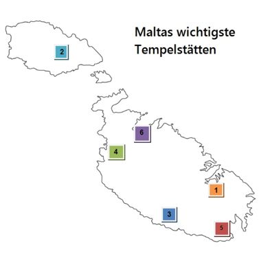 Abb. 1 1) Hypogäum Hal Saflieni und Tarxien Tempel; 2) Ggantija Tempel und Xaghra Steinkreis in Gozo; 3) Hagar Qim und Mnajdra; 4) Ta Hagrat und Skorba; 5) Borg-in-Nadur und Höhle Ghar Dalam; 6) Bugibba-Tempel und Tal Qadi