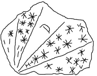 Auch der Besuch des Tempels Bugibba im gleichnamigen Ort war nicht möglich, da er auf dem Gelände eines Hotels liegt, wo mir der Zugang verwehrt wurde. Mit dem gleichen negativen Erfolg gekrönt war mein letzter Versuch, den Tempel von Tal Qadi aufzusuchen. Wegen Bauarbeiten waren alle Zugangsstraßen gesperrt. Dieser Tempel ist erwähnenswert, weil dort eine Steinplatte von 29 x 23,5 x 5 cm gefunden wurde, auf der die Menschen jener Zeit ganz offensichtlich Aufzeichnungen über Sterne und den Mond machten, die in den Stein geritzt sind. [1] Die Steinplatte ist ein Fragment einer ursprünglich wahrscheinlich viel größeren Platte, auf der der Himmel von einem zentralen Punkt aus in Segmente unterteilt wurde. Die nebenstehende Abbildung (Abb. 7) ist eine Nachskizzierung eines Fotos der Steinplatte.