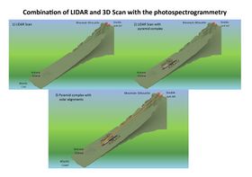 This close-up is not from a drone, but from the 3D image. Ramon's team digitized an area of 64,000 m². This "image" is now ready for "further processing".Die Fortschritte in der Computertechnologie machen Anwendungen möglich, von denen jeder Astro-Archäologe noch vor 10 Jahren geträumt hätte. Umgerechnet in die richtigen „Meta-Daten“ kann man das 3D Modell in jede Anwendung einfach „einkopieren“ und ausrichten. Danach kann man Anwendungen realisieren, wozu die Archäologen mit Landvermessern Wochen bis Monate bräuchten, um zu ähnlichen Schlussfolgerungen – wie in diesem Beispiel dem „Doppelten Sonnenuntergang“ zu kommen. Die Zukunft war gestern! Bild 1) Das reine LIDRA-Profil des Bergabhangs vor Güimar bis zur Atlantikküste. Bild 2) Das holistische 3D-Modell einkopiert in die Vulkanlandschaft. Bild 3) Erste Georeferenzierungen zu dem „Doppelten Sonnenuntergang“ an der Tag-Nacht-Gleiche//