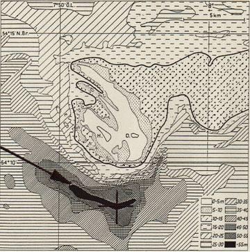 Der Asteroid Phaéthon fiel also der antiken Sage nach in die bronzezeitliche Eider- oder Elbmündung südlich von Helgoland. Tatsächlich gibt es einige geologische Besonderheiten (Abb. 6), die nur durch das Einwirken eines plötzlichen, schockartigen Ereignisses erklärbar sind. Einmal ist es ein etwa zehn Meter hoher untermeerischer Steilabbruch dreihundert Meter vor der Westküste, der einem allmählichen Absinken des Felsmassivs völlig widerspricht. Aus dem Abstand zur heutigen Brandungsküste kann auf einen Zeitpunkt vor rund 3000 Jahren geschlossen werden (Spanuth 1965, S. 155). Auf ein anderes Phänomen machte 1977 der Kieler Geologe Harald Steinert aufmerksam. Etwa fünfunddreißig Kilometer nördlich von Helgoland wurden bei seismischen Messungen ganz unerwartet mehrere „Aufschuppungen“ im ansonsten flachen Nordseegrund festgestellt. Alle fünfhundert bis tausend Meter Entfernung voneinander wurde bis zu zehnmal aus einer Tiefe von hundert Metern heraus der Meeresboden schräg gestellt, und das deutet auf einen sehr hohen Druck aus südöstlicher Richtung hin.