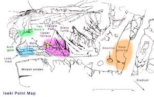 Prof. Masaaki Kimura: "Zum 'Dreieck-Pool': Die Form der Einbuchtung erscheint als Dreieck. Sie ähnelt einem "Kaa", das ist eine künstliche Trinkwasser-Quelle bei einer Gusuku-Burg des alten Okinawa. 'Gusuku' steht für eine Burg mit integriertem Tempel auf Okinawa. Der 'Rundweg': Es gibt da einen Bereich, der wie ein Rundweg erscheint, der um das Monument Nr.1 herumführt. Der breiteste Teil ist 15 m und ein durchschnittlicher Abschnitt ist 6 Meter breit. Das 'Bogen-Tor': Es gibt [dort] Stein-Umfriedungen, welche die Rundweg umgeben. Der Eingang zum 'Rundweg' scheint ein Bogentor mit einer Höhe von 1,7 Meter und einer Breite von 1 Meter zu sein."