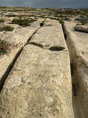 Diese Spurenpaare, Cart Ruts genannt, überziehen besonders die Hochflächen der Inseln mit einem dichten Netz. Durch die starke Bebauung sind bereits viele zerstört, ohne vorher kartiert worden zu sein. Ein Fahrzeug mit Rädern bleibt in den engen Kurven stecken. Wie die Schienen auf einem Kopfbahnhof verlaufen viele Rillen teilweise parallel nebeneinander, bevor sie sich trennen. Die Richtung anderer kann man kilometerweit verfolgen. An einigen Stellen zerschneidet z. B. eine bronzezeitliche Zisterne oder ein punisches Grab diese Spuren. Daher sind sie älter und dem Megalithvolk zuzuordnen.