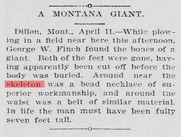 "Dillon, Montana, 11. April - Während er heute nachmittag ein Feld hier in der Nähe pflügte, fand George W. Finch die Knochen eines Riesen. Beide Füße waren verschwunden, augenscheinlich waren sie abgeschnitten worden, bevor der Körper bestattet wurde. In der näheren Umgebung des Skeletts befand sich eine Halskette von anspruchsvoller Qualitätsarbeit, und um seine Taille herum war ein Gürtel aus einem ähnlichen Material. Zu seinen Lebzeiten muss der Mann volle sieben Fuß [ca. 2,13 m; d.Ü.] groß gewesen sein." [5]