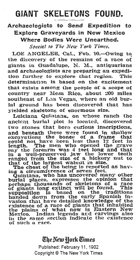 Abschließend heißt es in dem Artikel der New York Times: "Quintana, der schon viele andere Grabstätten ausgeraben hat, verlieh seiner Meinung Ausdruck, dass womöglich tausende von Skeletten einer längst ausgestorbenen Rasse von Riesen entdeckt werden. Diese Annahme basiert auf den Überlieferungen, die von den frühen spanischen Eroberern weitergegeben wurden, die detaillierte Kenntnisse von der Existenz einer Rasse von Riesen hatten, welche die Gegend bewohnten, welche heute das östliche New Mexiko ist. Auch indianische Legenden und Gravierungen in selbiger Gegend legen die [vormalige] Existenz solch einer Rasse nahe." [4]