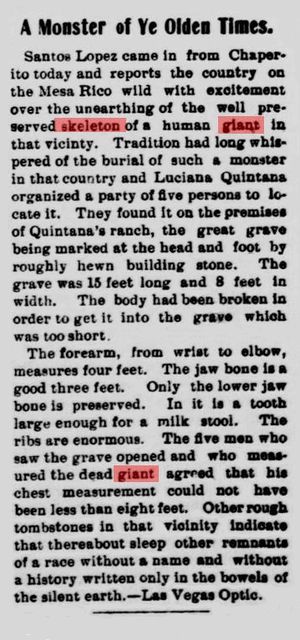 In der Las Vegas Daily Optic vom 27. März 1900 finden wir zudem folgende Kurzmeldung: "Skelette zweier außergewöhnlich großer Männer wurden in den White Sands [7] im Doña Ana County gefunden, eta 30 Meilen [ca. 48,28 km; d.Ü.] etfernt von Tularosa, New Mexico. Die Prospektoren, welche die Skelette fanden, vermaßen sie und fanden heraus, dass sie 9 Fuß und drei Zoll [ca. 2,82 m; d.Ü.] sowie acht Fuß und neun Zoll [ca. 2,67 m; d.Ü.] groß waren.