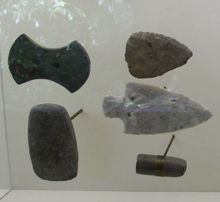 Bei der Öffnung eines der Gräber wurde ein Skelett von mehr als sechs Fuß [ca. 1,83 m; d.Ü.] Länge [17] zutage gefördert. Neben dem rechten Arm fanden sich eine Anzahl kleiner Stein-Beile, Perlen und Zierrat von besonderer Kunstfertigkeit. Mehrere große Speer- und Pfeilspitzen aus Flintstein zwischen den Rippen zeugten davon, dass der Krieger im Kampf gefallen war.