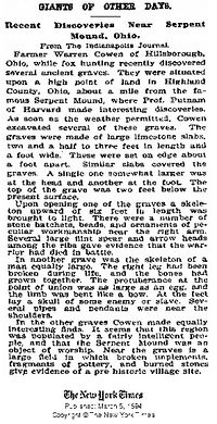 - ↑ Quelle: The New York Times, GIANTS OF OTHER DAYS - Recent Discoveries Near Serpent Mound, Ohio,