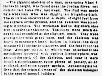"Das gigantische Skelett eines Mannes, der 8 Fuß und 6 Inches [ca. 2,60 m; d.Ü.] maß, wurde in der Nähe des Jordan River, knapp außerhalb von Salt Lake City gefunden. Der Fund wurde von einem Arbeiter gemacht, der einen Bewässerungsgraben aushob. Der Schädel wurde in einer Tiefe von acht Fuß unter der Oberfläche des Bodens ausgegraben, und das Skelett stand kerzengerade aufrecht. Der Arbeiter musste noch neun Fuß tief graben, um es zu exhumieren. Die Knochen waren stark verrottet und zerkrümelten bei der geringsten Berührtung. Sie wurden mit großer Sorgfalt zusammengebracht und es wurde herausgefunden, dass das Skelett achr Fuß und sechs Inches maß; der Schädel maß elf Inches [ca. 28 cm; d.Ü] im Durchmesser, und die Füße waren 19 Inches [ca. 48 cm; d.Ü.] lang.