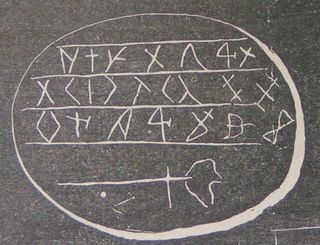 - ↑ Quelle: ebd.; Anmerkung: Bei Barry Fell auf Englisch: "(1) The mound raised-on-high for Tasach (2) This tile (3) (His) queen caused-to-be-made"