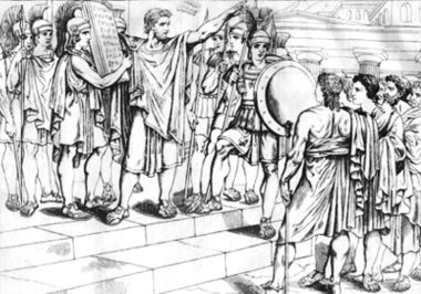 Man sollte daher annehmen, dass Platon keinerlei Sympathie für Sparta hegte, doch in der Tat entwickelte er ein äußerst ambivalentes Verhältnis zu diesem Erzfeind seiner Heimatstadt. Dazu heißt es bei Jens Nagel: "Obwohl Platon Sparta [...] verachtete, muss ihn die scheinbare [7] Stabilität des Staates und die legendäre Genügsamkeit, Abhärtung und Professionalität der Spartanischen Krieger beeindruckt haben" [8], und zwar so sehr, dass, wie es in einer anderen Quelle heißt, ausgerechnet Sparta ""als Idealsta[a]t in Platons Politeia eingegangen ist." [9] Dabei faszinierten ihn offensichtlich, wie wir noch sehen werden, insbesondere die Gesetzte Spartas, die dem historisch kaum greifbaren, legendären Prinzen Lykurg (Abb. 4) zugeschrieben wurden.