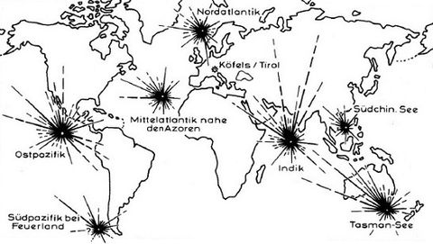 "Die Einschlagsgebiete der sieben Hauptfragmente des Sintflut-Kometen und der große Festlandtreffer bei Köfels in Österreich aufgrund der Gesamtheit der geologischen und mythologischen Indizien. Die im ersten Moment verblüffend weite, noch über eine Hemisphäre hinausreichende Streu wird bei Berücksichtigung der Erdrotation verständlich, da größere zeitliche Verzögerungen zwischen den Einzeleinschlagstellen auftraten (siehe S. 128f.). Darauf weisen auch Mythen der Alten Welt (z.B. Perser) und der Indianer (ihr pazifischer Haupteinschlag) hin." [11]