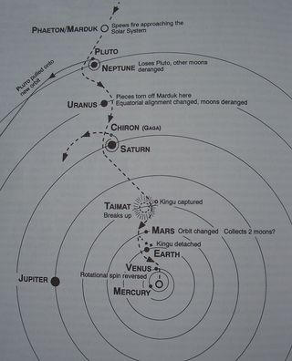 - Der Interpretation des sumerischen Schöpfungsmythos durch den armenisch/US-amerikanischen Prä-Astronautik-Autor Zecharia Sitchin (1920-2010) zufolge [6], bestand das solare System ursprünglich aus der Sonne (Apsu) und neun Planeten: Merkur (Mummu), Venus (Lahamu), Mars (Lahmu), Tiamat, Jupiter (Kishar), Saturn (Anshar), Pluto (Gaga), Uranus (Anu) und Neptun (Ea). Die Erde und der Mond existierten zu dieser Zeit noch nicht. Plutos Umlaufbahn verlief damals zwischen jenen von Saturn und Uranus, die der Tiamat zwischen den Orbitalbahnen von Mars und Jupiter. [7]