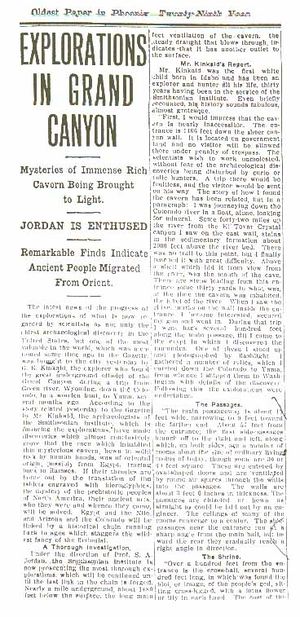 Ich erklärte ihr, dass ich eine Story aus dem Artikel einer Zeitung aus Phoenix von 1909 über die Entdeckung von in den Felsen gehauenen Grüften durch die Smithsonian Institution im Grand Canyon untersuchte, wo ägyptische Artefakte entdeckt worden seien, und fragte sie, ob die Smithsonian irgendwelche weiteren Informationen zu dieser Angelegenheit geben könne.