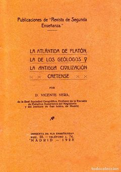Im Jahr 1925 veröffentlichte Prof. Vera in Form einer Broschüre (Abb. 1) ein Essay mit dem Titel LA ATLÁNTIDA DE PLATÓN, LA DE LOS GEÓLOGOS Y LA ANTIGUA CIVILIZACIÓN CRETENSE (Das Atlantis Platons, das der Geologen, und die alte kretische Zivilisation). Dies stellt quasi eine Fortführung der vorausgegangenen Arbeiten von K.T. Frost und James Baikie dar, welche die frühesten Befürworter einer Verbindung zwischen Atlantis und dem minoischen Kreta waren. Selbige Vorstellung wurde später von Spyridon Marinatos erweitert, wobei dieser den Ausbruch des Inselvulkans Thera im 2. Jahrtausend vor der Zeitenwende als Auslöser für die Vernichtung von Atlantis mit einbezog. [4]