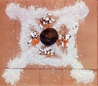 Am frühen Morgen mußte alles schnell gehen. Wolken ballten sich zusammen, Regeln prasselte. Wir suchten einen Regenbogen. Und dort, wo er die Erde berührt zu haben schien, wurde dann das Ritual zelebriert. Doch zunächst mußte wir ein "Mäuerchen", etwa fünfzehn Zentimeter hoch, zwei mal zwei Meter im Quadrat, errichten. Das brachte uns blutige Hände ein. Das Zentrum dieses "Tempels" legte der Priester mit Pappe aus. Darauf zeichnete er ein kleines Quadrat aus weißlichen Steinen. Von dessen Zentrum führten vier Linien, ebenfalls aus "Steinchen" gezeichnet, nach außen. Und im Zentrum wiederum lag ein schwarzer, eiförmiger Stein, vermutlich aus Vulkangestein.