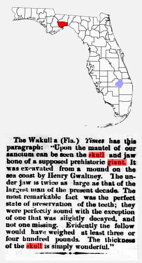 Nachfolgende Meldung (Abb. 5) behandelt einen Fund im Wakulla County, über den es in der Ausgabe des Columbus Journals vom 27. April 1887 hieß: "Die Wakulla Times (Florida) hat folgenden Abschnitt zu bieten: >Auf der Kaminumfassung unseres Privatzimmers kann der Schädel und der Kieferknochen eines mutmaßlichen prähistorischen Riesen angeschaut werden. Er wurde von Henry Gwaltney aus einem Mound an der Meeresküste ausgegraben. Der Unterkiefer ist doppelt so groß wie der des größten Mannes der gegenwärtigen Dekade. Das bemerkenswerteste Faktum war der perfekte Erhaltungs-Zustand der Zähne; sie waren perfekt in Ordnung, mit Ausnahm von einem, der leicht verfault war, und nicht einer fehlte. Offenkundig muss der Bursche mindestens drei- oder vierhundert Pfund gewogen haben. Die Stärke des Schädels ist einfach erstaunlich." [3]